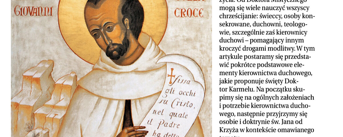 Święty Jan od Krzyża jest przede wszystkim przewodnikiem tych, którzy szukają większej zażyłości z Bogiem. Jego nauczanie jest bogate w doktrynę i pełne życia. Od Doktora Mistycznego mogą się wiele nauczyć wszyscy chrześcijanie: świeccy, osoby konsekrowane, duchowni, teologowie, szczególnie zaś kierownicy duchowi – pomagający innym kroczyć drogami modlitwy. W tym artykule postaramy się przedsta- wić pokrótce podstawowe elementy kierownictwa duchowego, jakie proponuje święty Doktor Karmelu. Na początku skupimy się na ogólnych założeniach i potrzebie kierownictwa duchowego, następnie przyjrzymy się osobie i doktrynie św. Jana od Krzyża w kontekście omawianego tematu.