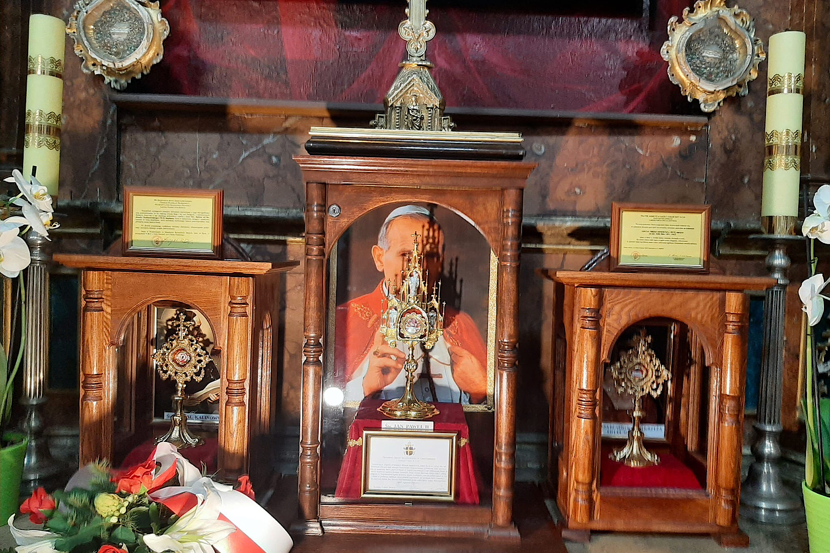 Relikwie zostały umieszczone w bocznym ołtarzu kościoła przy relikwiach św. Jana Pawła II i św. Teresy Benedykty od Krzyża – Edyty Stein, która gościła w Dusznikach w 1912 roku. Relikwiarze znajdują się w artystycznie wykonanych i zaszklonych gablotach, tworzących specyficzny tryptyk ze św. Janem Pawłem II w centrum i obojgiem świętych karmelitańskich po bokach. Dziękujemy za dar relikwii o. Szczepanowi Praśkiewiczowi, karmelicie bosemu, relatorowi Dykasterii Spraw Kanonizacyjnych w Rzymie.